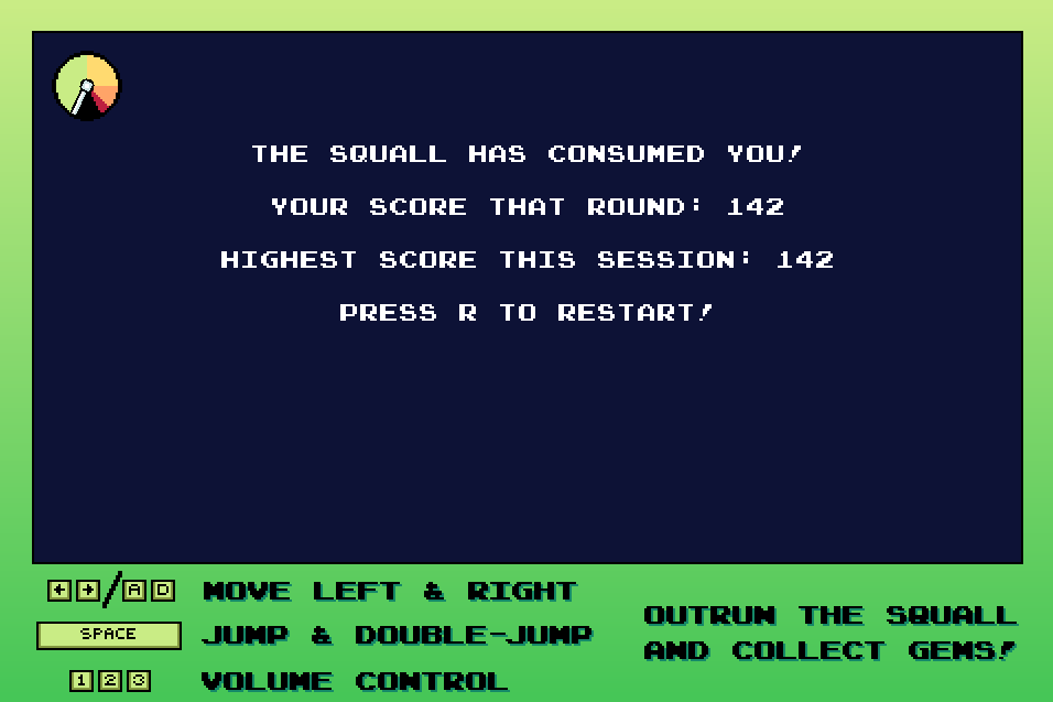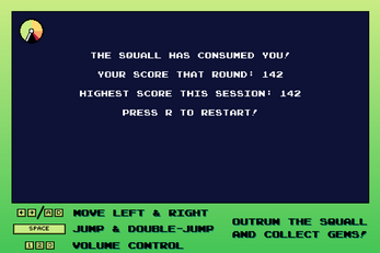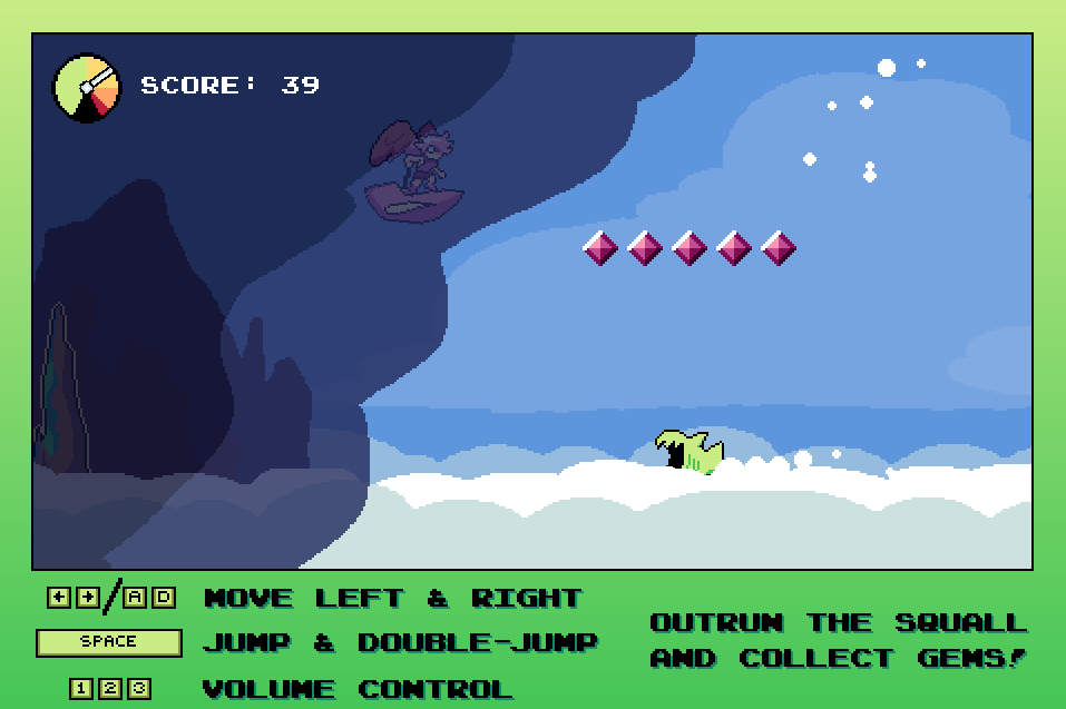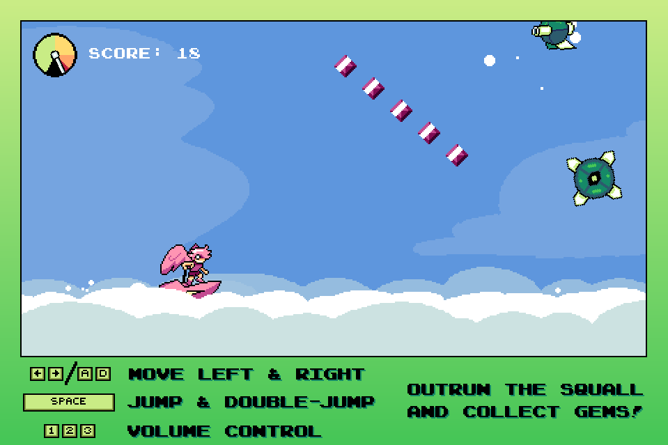 Squall Skimmer is an arcade game made for Mini Jam 198, with the theme of "Speed", and the limitation of "There is no end." Escape the Hearthsquall on your cloud skimmer, and collect some valuable Hori gems along the way! Watch out for the spikes of floating islands, skyfish, and the nefarious Remnant scourge!
